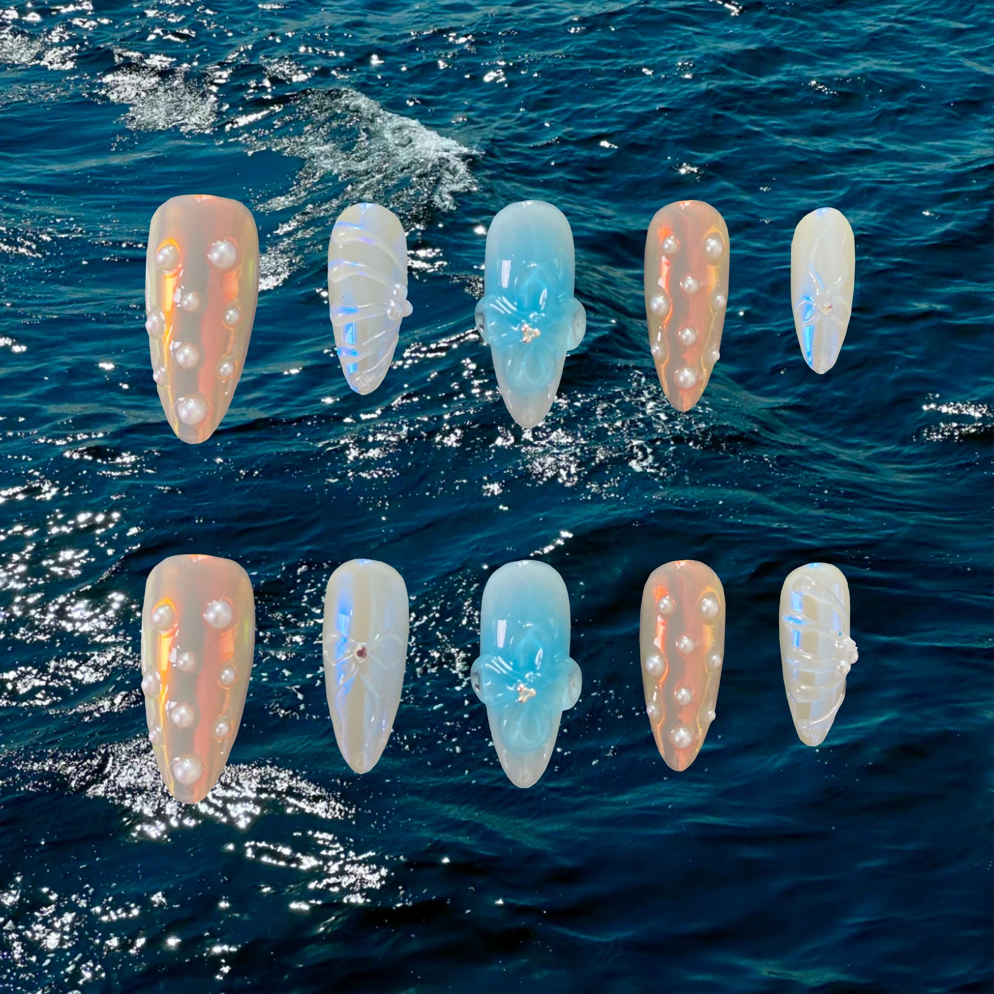 This exquisite set of press-on nails is inspired by the crystal-clear blues of the ocean and the shimmering sunlight as it dances across the water’s surface. Each nail features a pearlescent sheen, adorned with pearl accents, shell patterns, and 3D floral designs, inspired by the world of mermaids. The sun is right over the ocean At 11 A.M. We hope Ocean Shell makes you shine like waves under the midday sun.