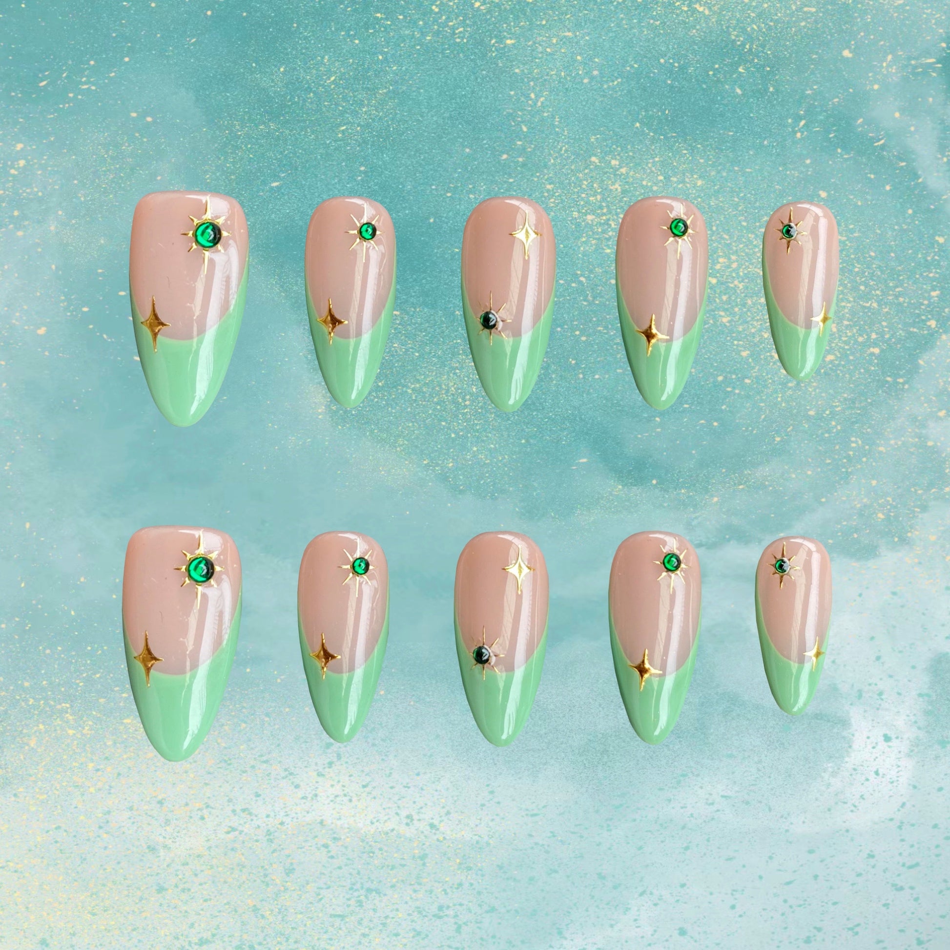 Each nail is embellished with golden stars and green gems, symbolizing the magical moment at 6 A.M., when the sun and stars might both appear in the sky, marking the transition between night and day. This refreshing set of nails features a vintage green theme,